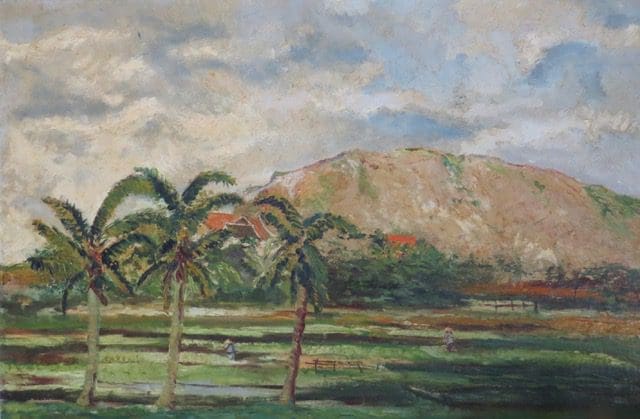 Het schilderij van LEND in de collectie van Luis, is een landschap met in de achtergrond een berg. De voorgrond toont de landbouwgronden van een plantage waar twee boeren de akkers bewerken, onder een bewolkte hemel. Luis wijst op de kegelvormige strooien hoeden van de boeren. “Het zijn Chinese boeren die werkten op plantage van Groot Kwartier,” legt hij uit. “Zij droegen de nón lá hoed als bescherming tegen de zon en gebruikten nog een houten juk met een mand aan weerszijden.”